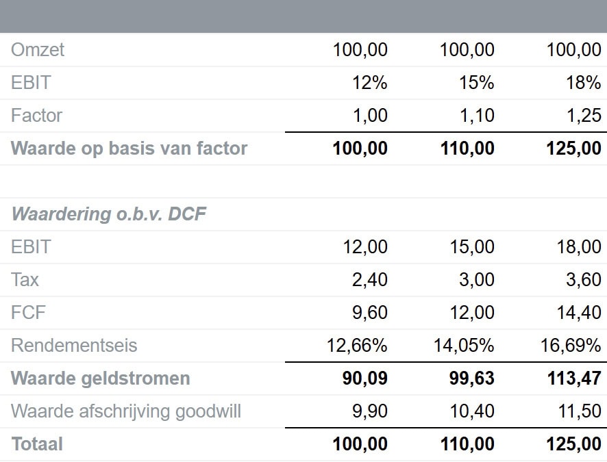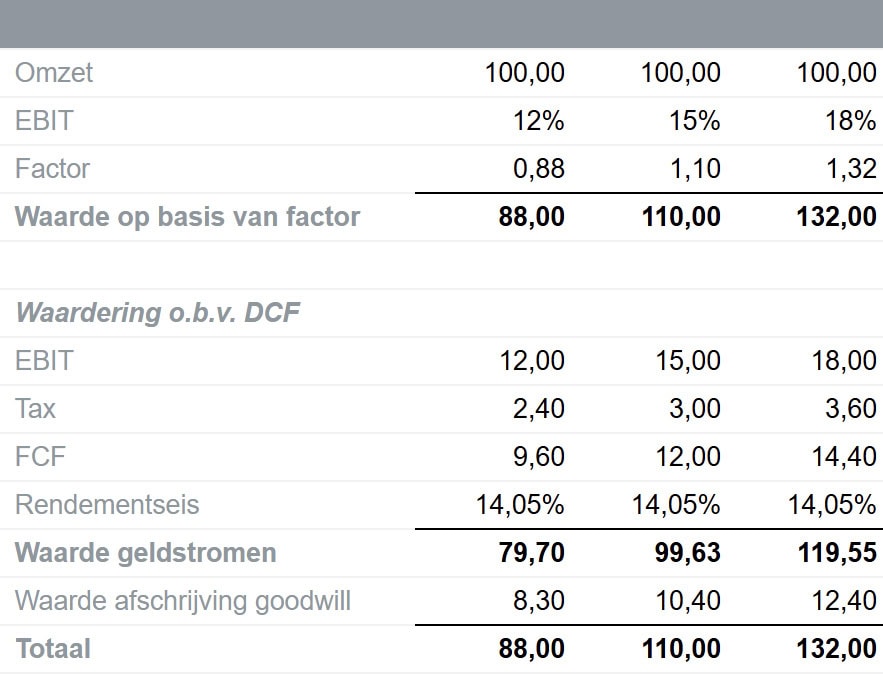 De volgende tabel geeft de logica aan tussen de omzetfactoren en een waardering op basis van geldstromen (DCF).
